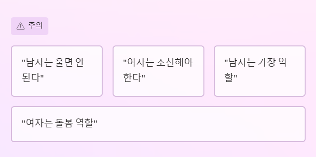 젠더 고정관념은 개인의 선택과 가능성을 제한할 수 있기 때문입니다. 특정 직업, 취미, 감정 표현을 성별에 따라 구분하는 인식은 개인의 자유를 줄이고, 사회적 갈등을 키울 수 있습니다.